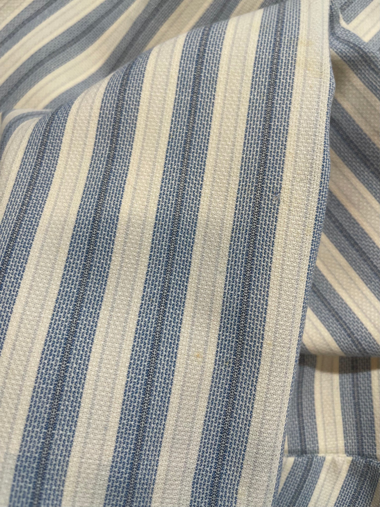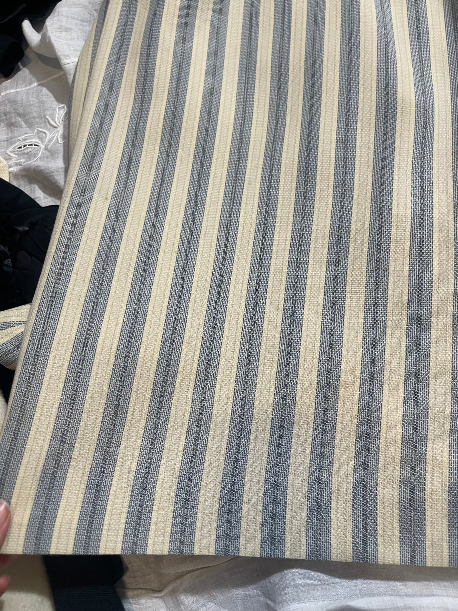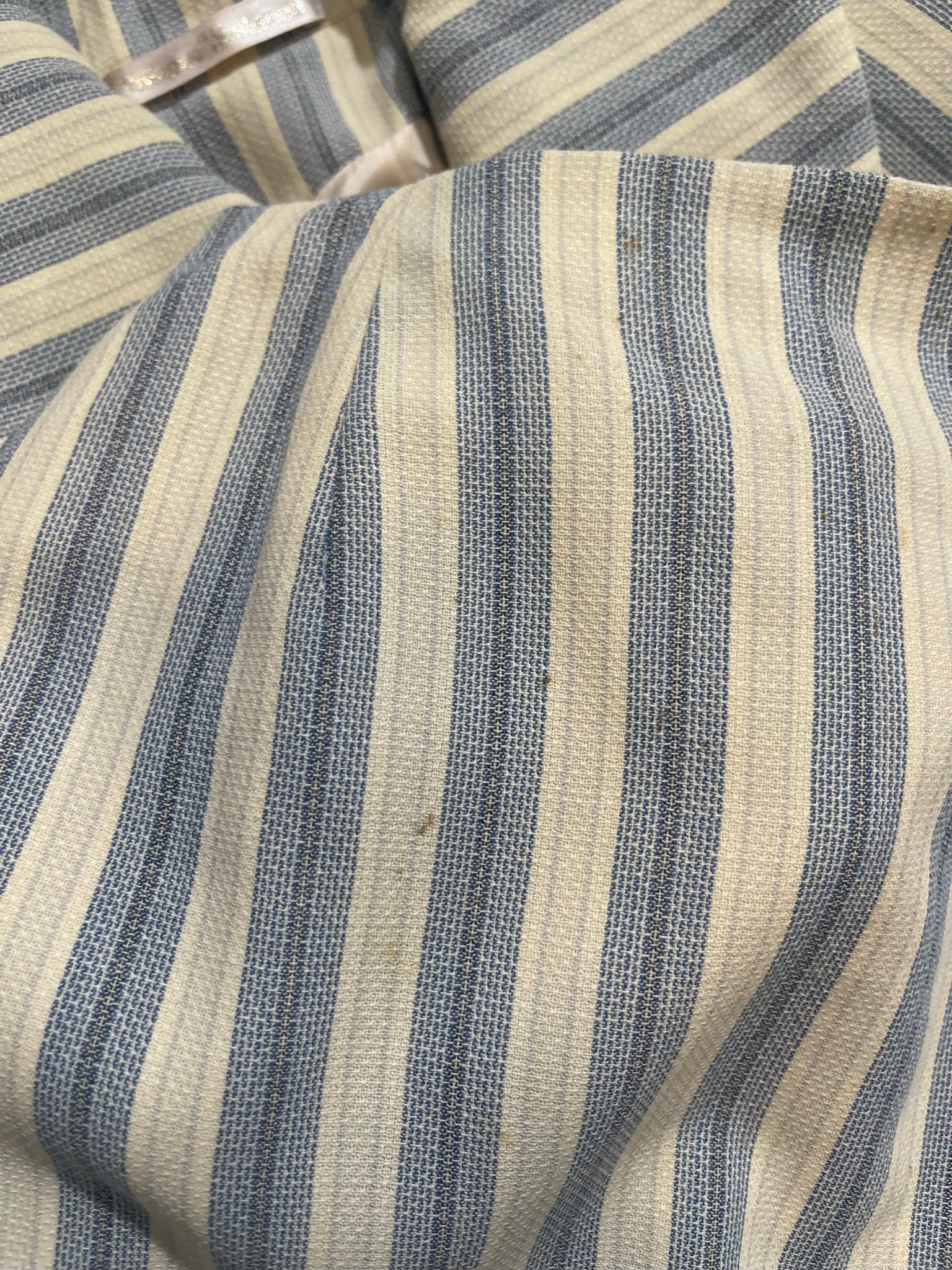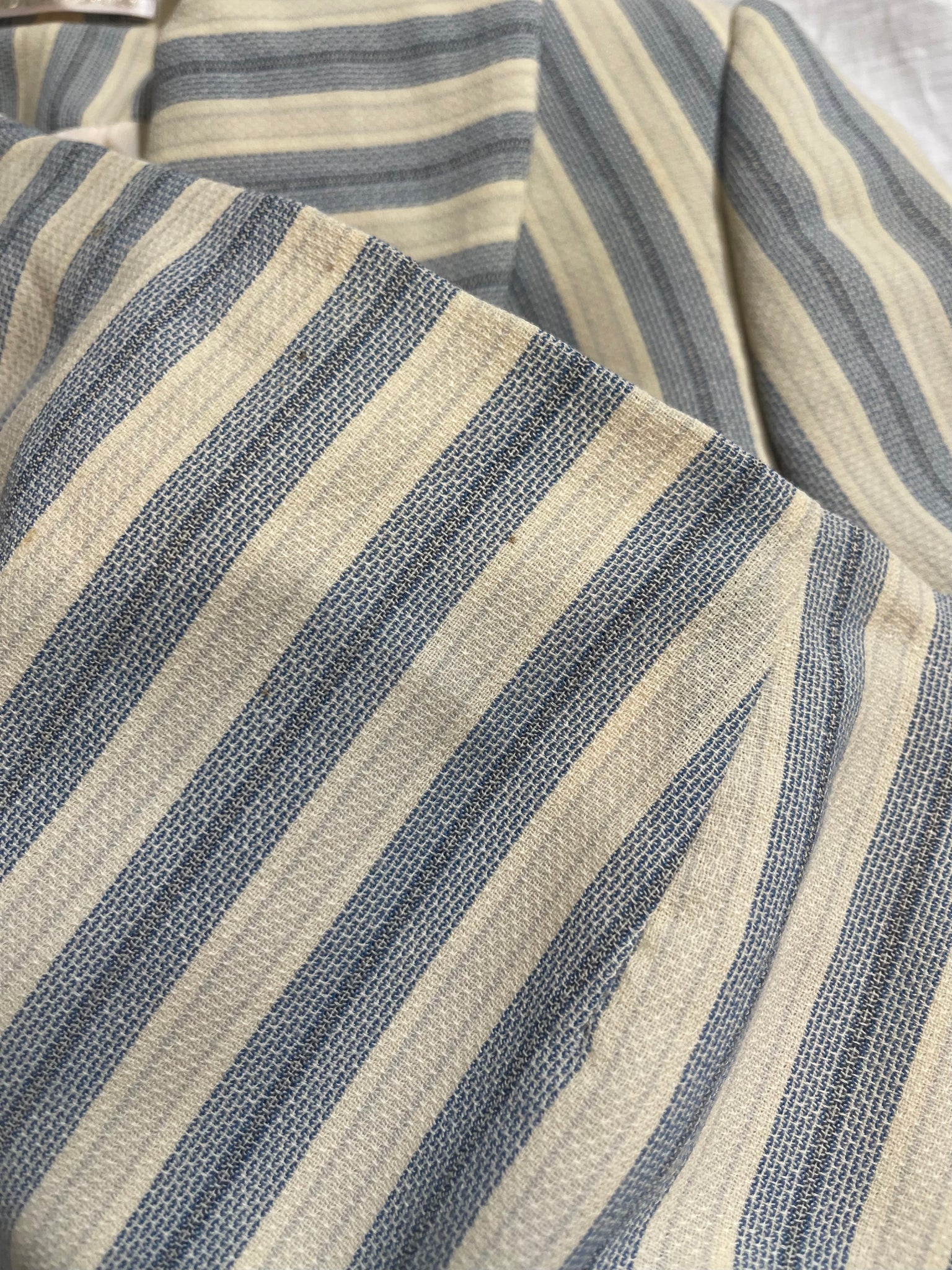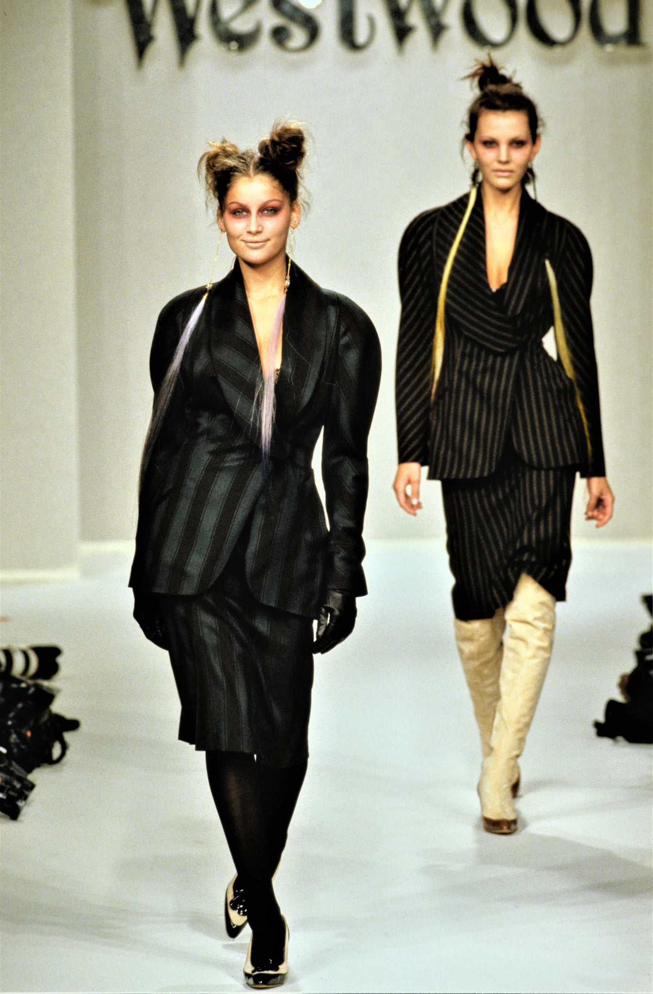 Vivienne Westwood blue and white striped mattress ticking skirt suit from her "Storm in a Teacup" fall 1996 collection.