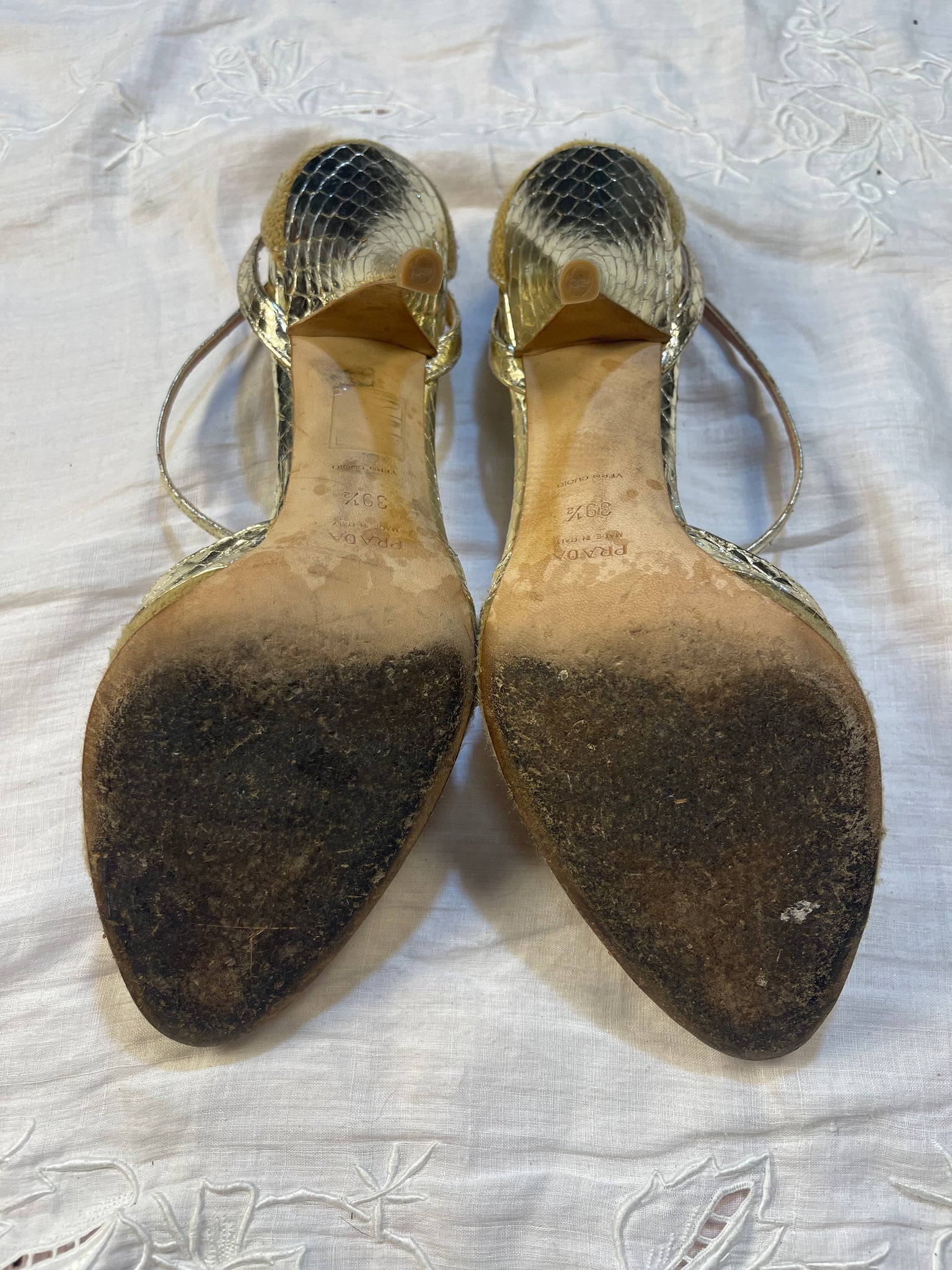 Prada gold snake skin heels.
