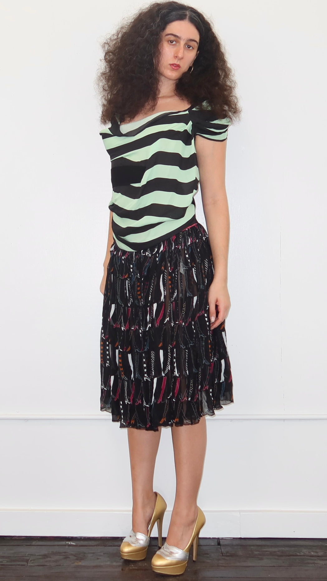 Veronique Leroy striped top with stretchy belt. The back is made of a stretch knit. Fits like a small.